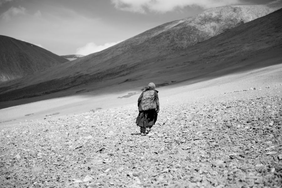 Tsering however sings it without rush or hurry. It’s quiet, not for performance or praise but for herself and her goats. As the day moves on, she will stop and sit, resting while the goats continue on. Taking the same path through the hills everyday they now naturally know where to go. Tsering looks back on the nomad settlement, their tents now tiny black and white specks in the distance.